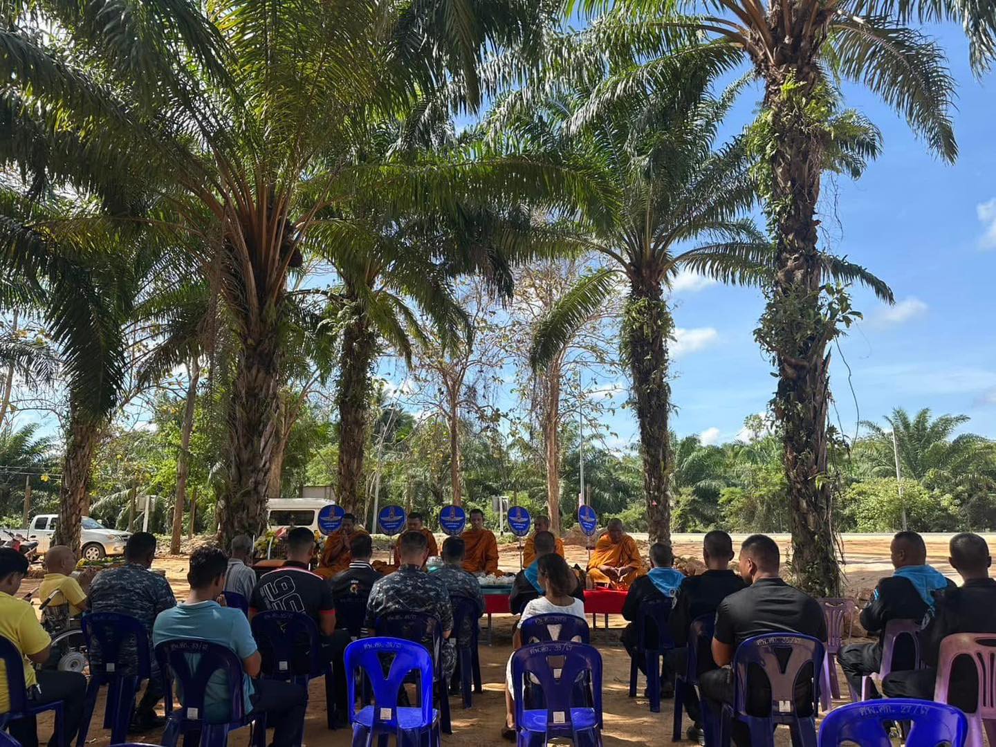 เพื่อเสริมสร้างความเป็นสิริมงคล และสร้างขวัญกำลังใจในการปฏิบัติงาน ในการนี้ได้นิมนต์พระสงฆ์มาเจริญพระพุทธมนต์พรมน้ำมนต์ ถวายภัตตาหารเพล และเครื่องสังฆทาน แด่พระสงฆ์ จำนวน 5 รูป ณ บริเวณสถานที่สร้างศูนย์พัฒนาศักยภาพคนพิการ จังหวัดชายแดนใต้ หมู่ที่ 7 ต.บ่อทอง อ.หนองจิก จ.ปัตตานี
